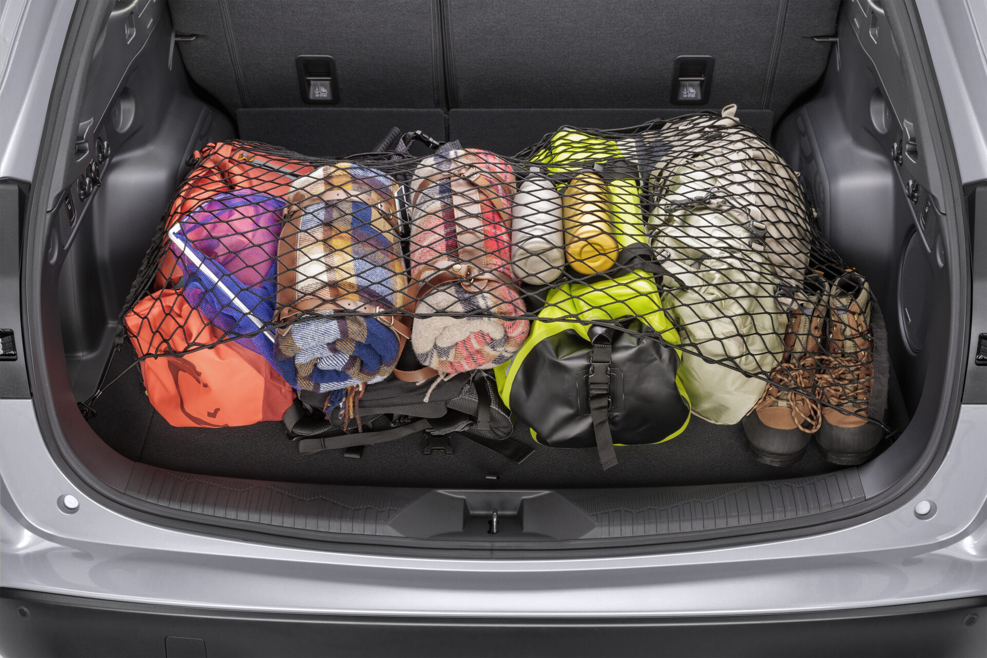 La presa di alimentazione da 12 V, il tasto per abbassare i sedili posteriori e i ganci fermabagagli sono tutti a portata di mano. Gli agganci per la rete di carico si trovano ai quattro angoli del bagagliaio per permetterti di utilizzare la rete in modo semplice.