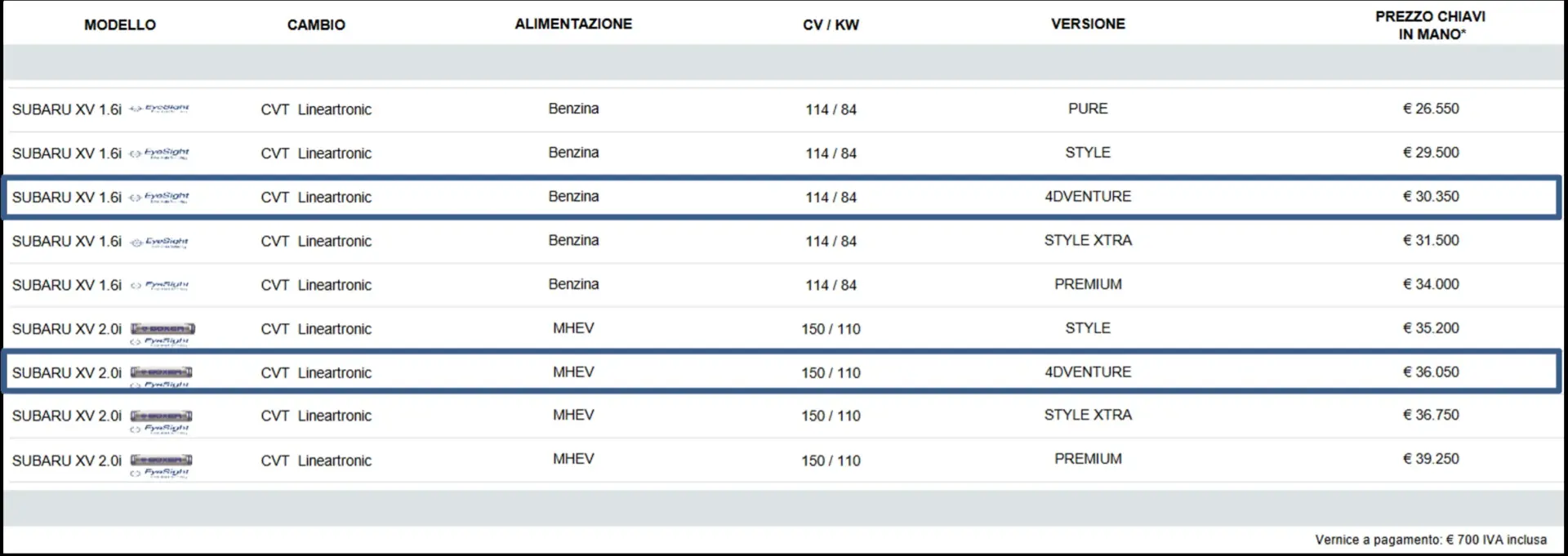 La nuova SUBARU XV 4DVENTURE è disponibile sia in versione benzina 1,6L, che con powertain ibrido e-BOXER e con tutte le colorazioni previste anche per gli altri allestimenti. Come per tutti i gli altri modelli della gamma, anche per SUBARU XV 4DVENTURE è prevista SUBARUSAFE8, la garanzia illimitata 8 anni per tutti i nuovi clienti del marchio a 6 stelle. Un’offerta unica che prevede una copertura “bumper to bumper” e senza limiti in termini di chilometraggio. SUBARUSAFE8 è legata al numero di telaio e dunque resta valida anche in caso di passaggio di proprietà.